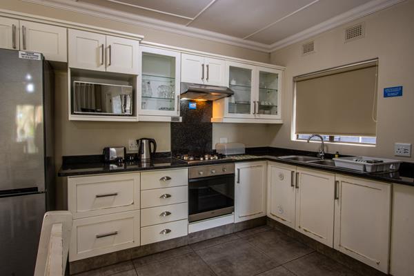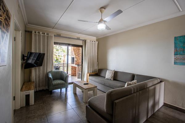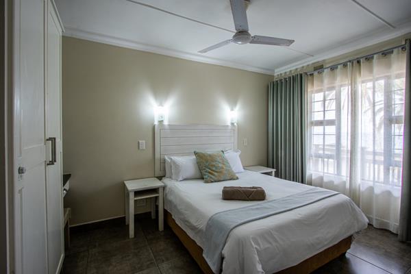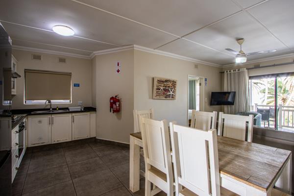 Banana Beach Club D15 Chalet is on the first floor and has a fully equipped kitchen, and lounge area, with a TV, WIFI and a Smart Box , The lounge contains a couch that can accommodate 2 small children under 10 years old. And has 2 bedrooms with a queen bed in the main bedroom and 2 single beds in the second bedroom, and 2 bathrooms, a veranda with a braai facility as well as covered parking.