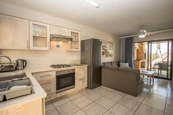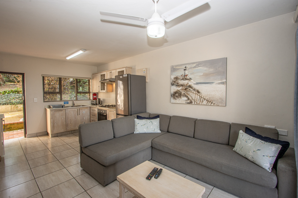 Banana Beach Club E2 is a ground floor chalet and has a fully equipped kitchen, lounge area with a couch that can accommodate 2 small children under 10 years old, a TV, 1 bedroom with a double bed and 1 bathroom, a veranda with braai facility as well as covered parking.