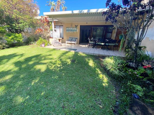 In a popular holiday complex right on the beach in Scottburgh South you will find this townhouse, beautifully decorated with a beach theme. The Apartment has an enclosed courtyard, single automated garage and parking space for another car. The open plan Kitchen is fully equipped with all you need, there is 2 fridge's, the second one is in the Garage. The open plan Lounge leads out through sliding doors to a covered patio with patio furniture, private braai and private garden. There is a pathway at the bottom of the garden for a short stroll to the beach entrance, a lovely quiet beach with rock pools and excellent for fishing.