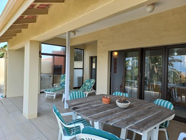 The home has a separate scullery with open plan kitchen to the dining room & lounge with a TV nook & large patio on the ground floor. Upstairs the home has three bedrooms, two of which have a balcony with a view of the ocean & two bathrooms, the main is en-suite. Single garage as well as a separate guest bedroom with en-suite bathroom finish off the ground floor offerings. One small dog allowed with prior permission of the trustees. There is a fenced off communal swimming pool & braai area.