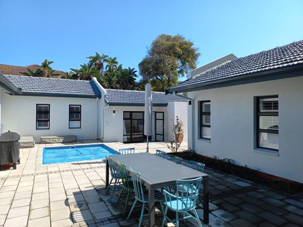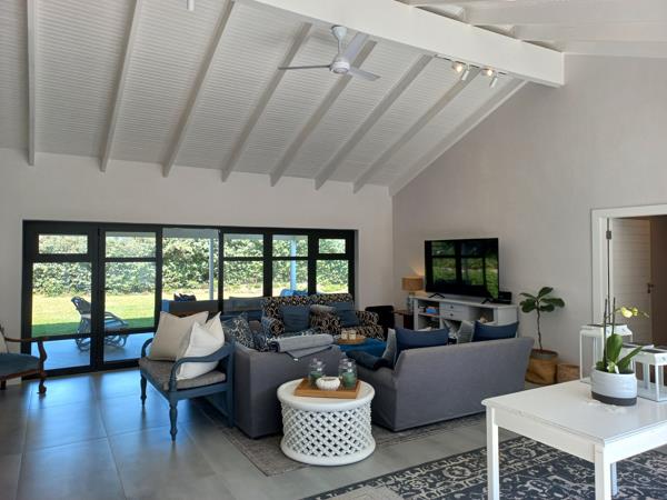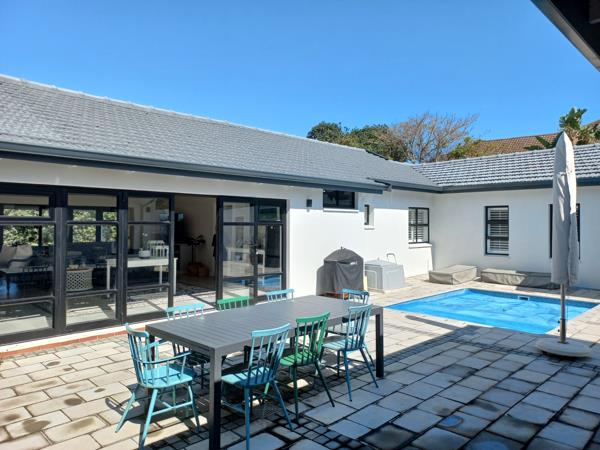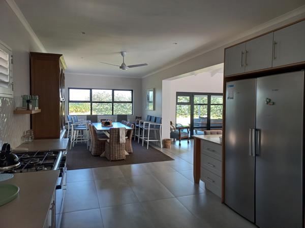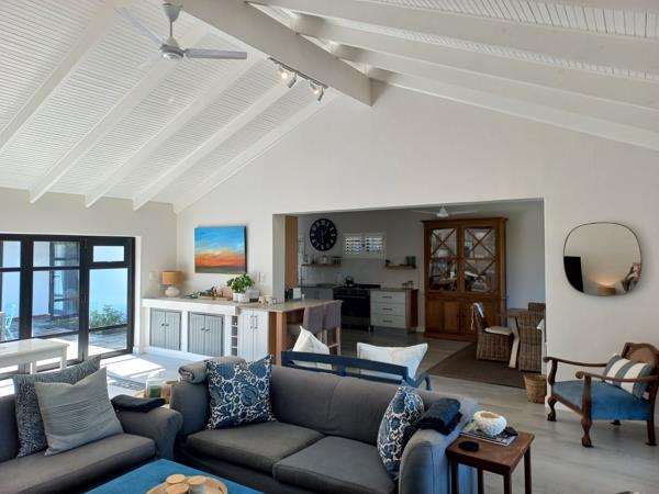 The living area is nestled between the front patio & deck which offers you breathtaking ocean views & the courtyard which offers you shelter from the wind, a delightful splash pool, gas braai & pizza over. The home is ideal for entertaining & creating lasting memories with family or simply relaxing in the sun listening to the waves crash nearby.