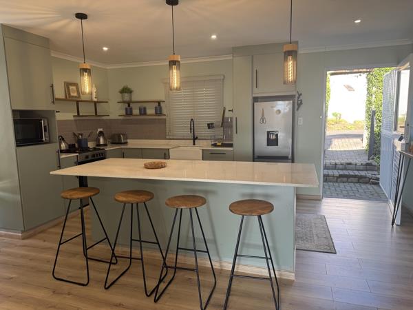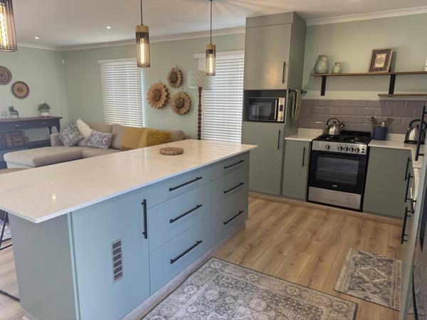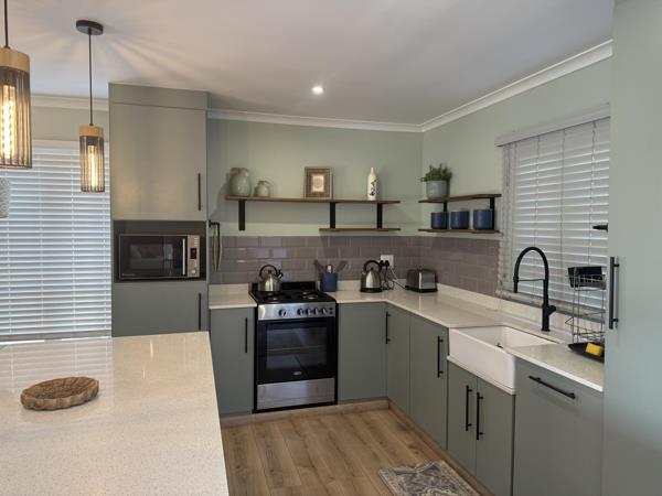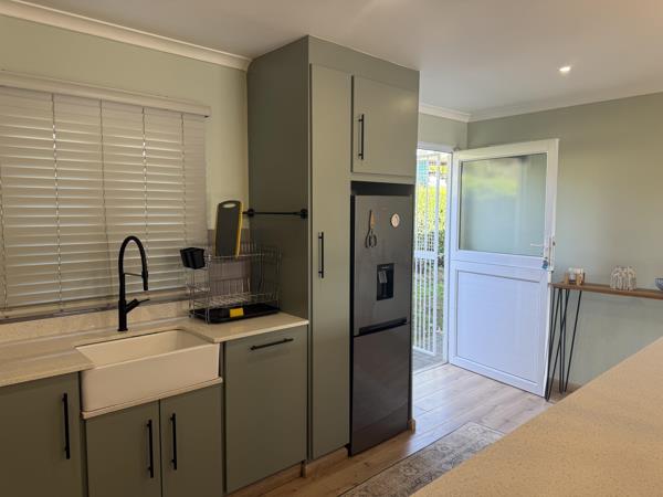 Step into a spacious open-plan lounge, dining area, and kitchen. The kitchen is fitted with a built-in gas stove - for ease during load shedding and built-in cupboards, fridge, and microwave perfect for easy living. The cozy lounge features a fireplace and wall-mounted TV, opening onto a covered patio with stunning views of a small dam. The bathroom is modern and elegant, featuring a walk-in shower. The washing machine is situated just outside the back door.