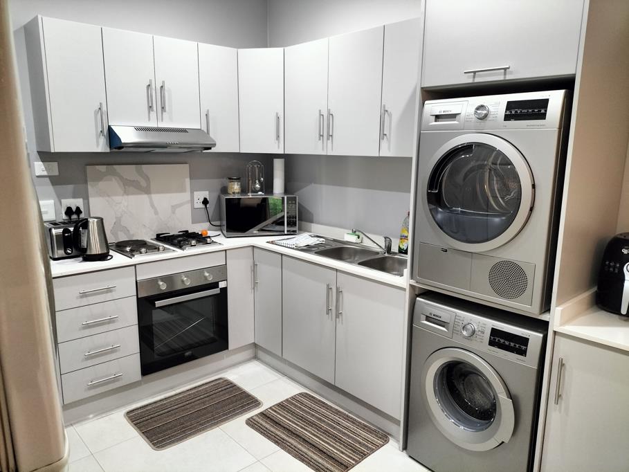 All kitchen appliances: air fryer, gas & electric hob, oven, fridge, washing machine, and dryer