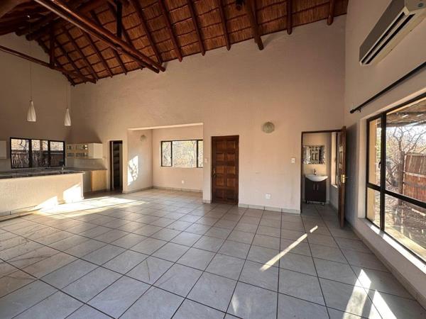 Discover an exceptional rental opportunity within the prestigious Hoedspruit Wildlife Estate, offering a unique blend of country living and metropolitan convenience. This distinctive thatched-roof property features four spacious bedrooms, each complemented by its own en-suite bathroom, ensuring privacy and comfort. The open-plan layout seamlessly integrates a welcoming lounge, a dedicated dining area, and a functional kitchen, all designed to maximize natural light and foster an inviting atmosphere. Large glass sliding doors enhance the indoor-outdoor flow, leading directly to the expansive outdoor living spaces.
