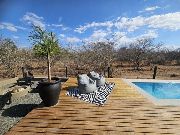 Sliding doors lead out onto a huge, covered patio, featuring a sitting area, dining table with seating for 6, outside bar and built-in braai. Enjoy your evenings in the warm South African evenings under the night-sky around the boma and fire-pit or while away your days in the inviting pool. Spectacular views of the mountain can also be seen from the deck.
