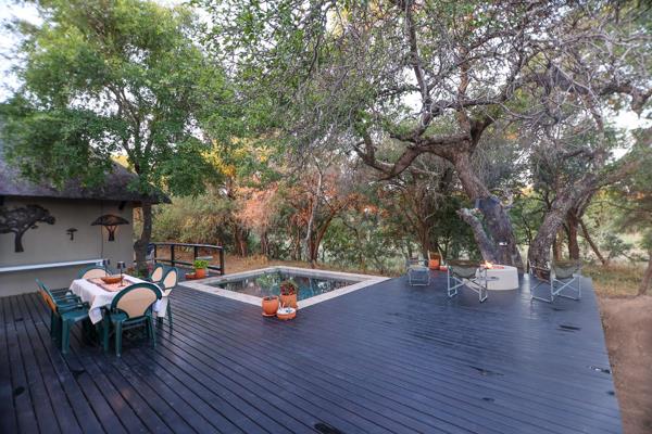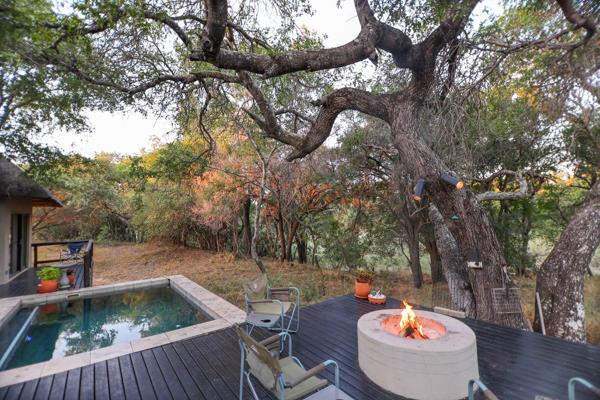 Each of the three spacious bedrooms boasts breathtaking views of the surrounding bush or the seasonal dry riverbed, creating a seamless connection with nature. The main bedroom includes an en-suite bathroom, while both bathrooms feature luxurious bathtubs and unique outdoor showers, offering a true safari-style experience.
