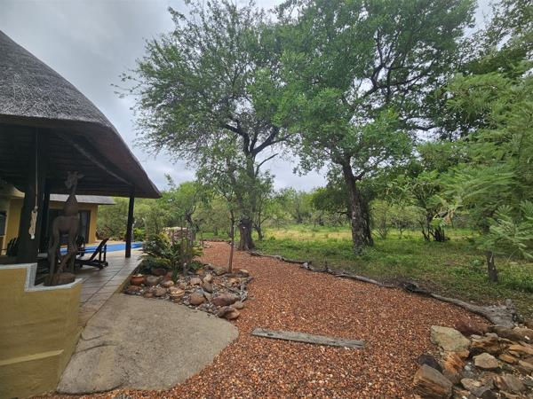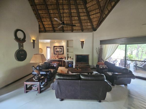 The lounge/dining room opens up to a huge covered patio with two large tables, plenty of seating and a braai area overlooking the bush, with the swimming pool alongside.