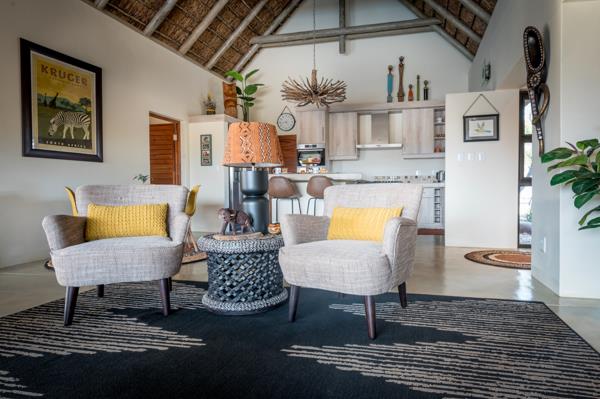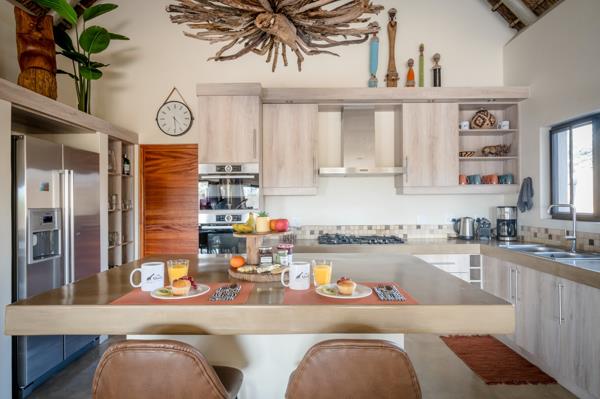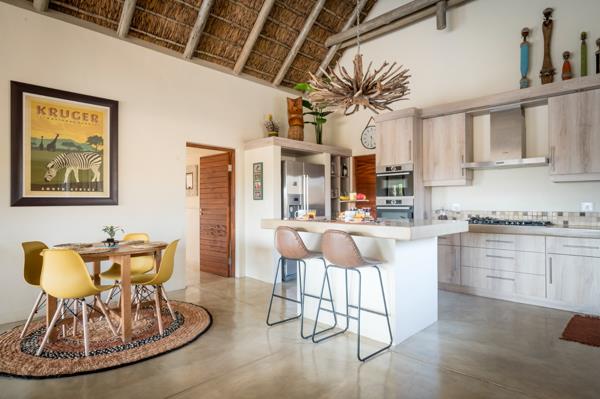 This villa incorporates all the warm tones that create a space of comfort and relaxation. The lounge is fitted with a corner sofa, a star viewer and flatscreen TV, media player and blue-ray player for movie nights with popcorn and smarties. Placed below a magnificent African inspired chandelier is an open styled kitchen that is equipped with all modern conveniences, including a center island for social memories, Nespresso coffee machine, gas top stove and an oven, as well as an American fridge that provides ice blocks to keep your drinks cool while enjoying them outside in the private heated swimming pool. Aside from the kitchen, the utility room you will find a washing machine, dryer, and dishwasher.