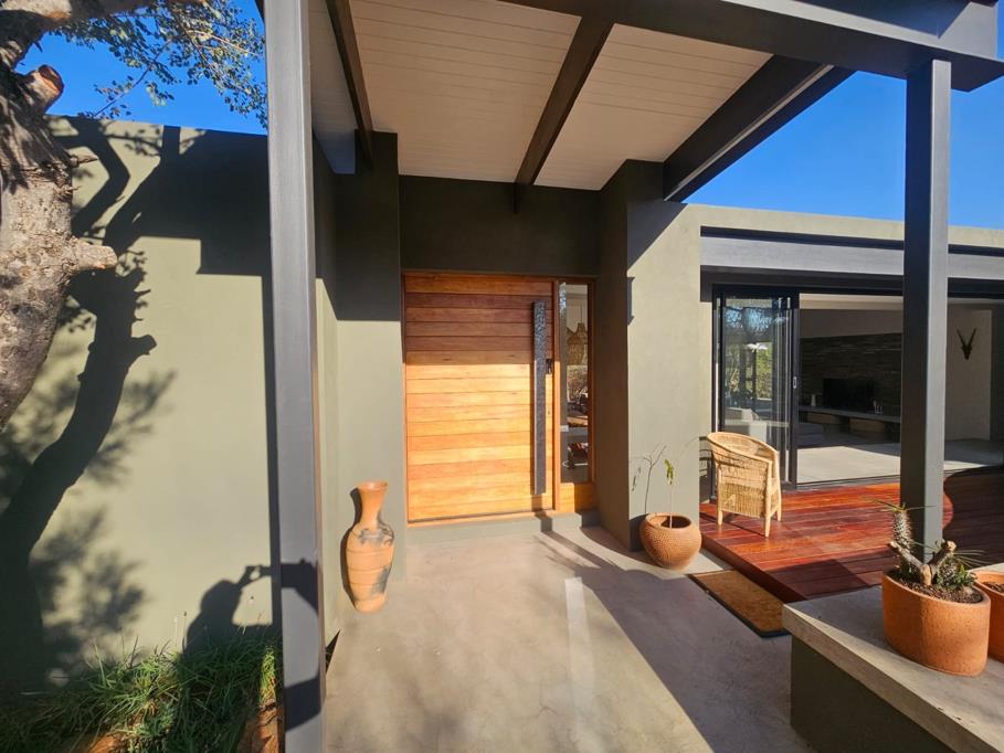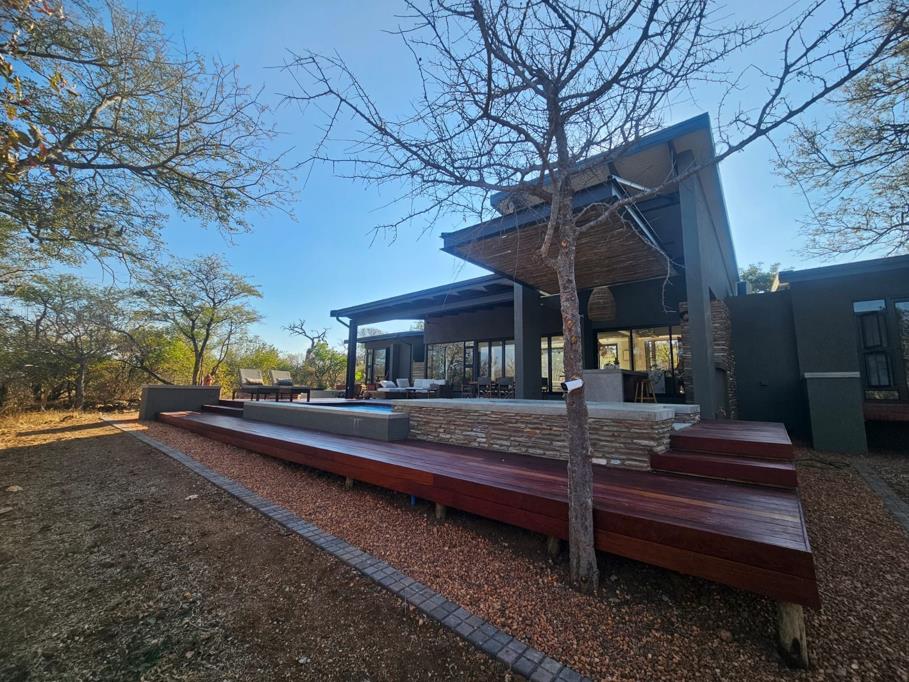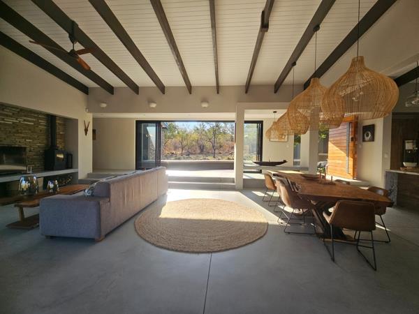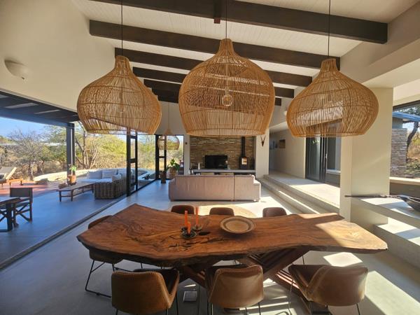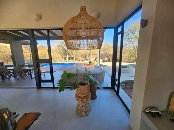 The contemporary design of this exclusively designed 4-bedroom, 3-bathroom home in Zandspruit Bush & Aero Estate offers modern bushveld living with an emphasis on comfort, space and connection to nature. The home features an expansive open-plan living area with high ceilings, a striking stone feature wall with fireplace and TV, beautiful wooden dining room table and fully equipped kitchen. Large stack doors create a seamless flow to generous covered patios and timber decks featuring a sparkling blue pool and plunge pool. The covered patio features another seating area, magnificent wooden dining table as well as a built-in breakfast bar, loungers around the pool and built-in braai to facilitate full enjoyment of the surrounding bush. Next to the patio is a boma with firepit to enjoy evenings around a fire. The modern kitchen with central marble island, double fridge, quality appliances and adjacent scullery/laundry add practical convenience, including another fridge as well as washing machine, tumble dryer and dishwasher.