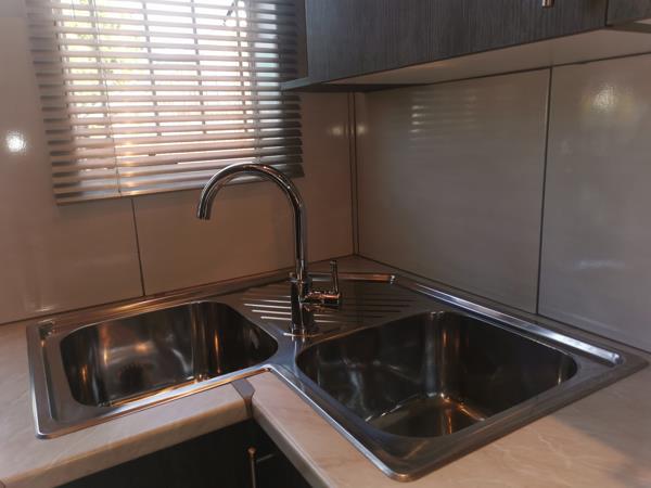 Double zinc, provision for a fridge, microwave and washing machine all neatly fitted in the kitchen and still space to move around.