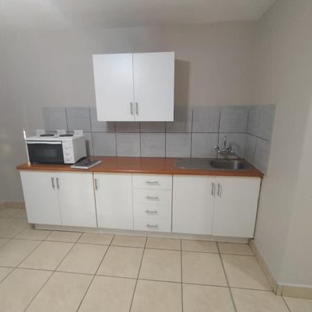 Flat consists of open space living room and bedroom that is divided by bedroom cupboard. Kitchen cabinets with zinc and a 30l mini stove and oven combination. Bathroom consists of shower with basin and toilet. Security cameras on property with remote controlled gate and electric fencing.