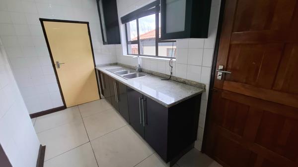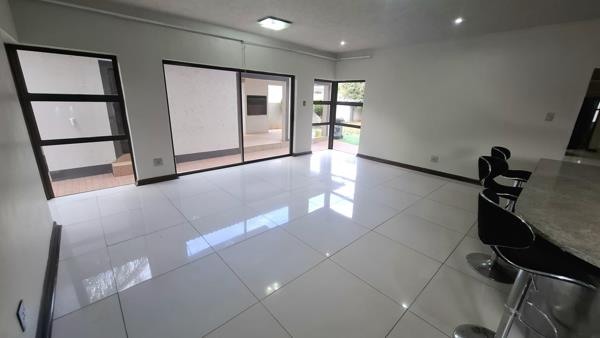The open-plan living area includes a built-in braai, air conditioning, and flows into a sleek kitchen with a central island, ample storage, and separate scullery. The dining area opens to a private backyardperfect for indoor-outdoor living.