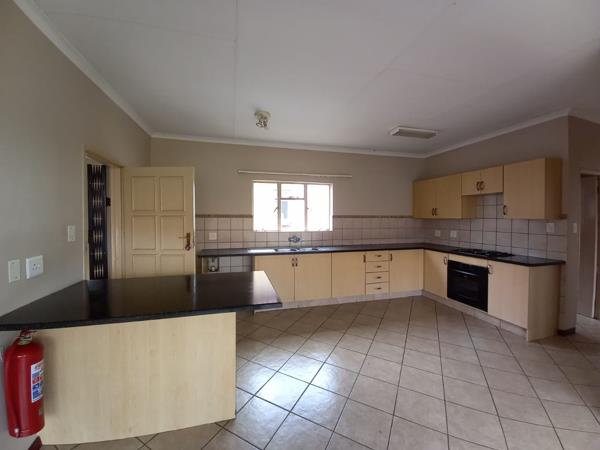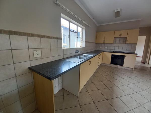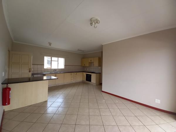 The unit features two spacious bedrooms with built-in cupboards and one full bathroom. The home boasts an open-plan living area that flows seamlessly into a large kitchen with ample cupboard space, perfect for everyday living and entertaining.