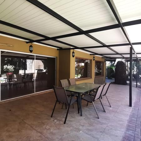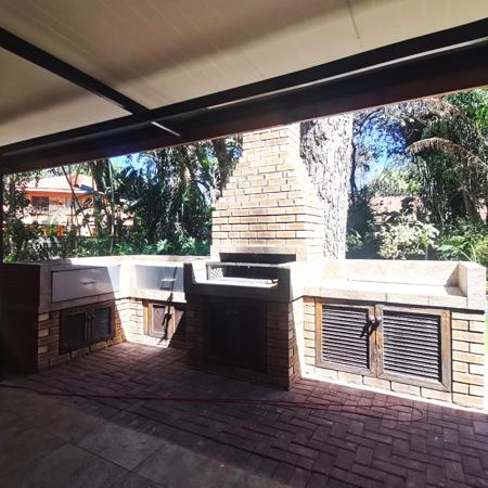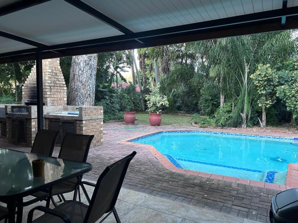 Outdoors, the property truly shines with a sparkling swimming pool, a spacious entertainment area, and a built-in braai, perfect for enjoying time with family and friends. The lush, beautifully kept garden, supported by an irrigation system, enhances the overall appeal.