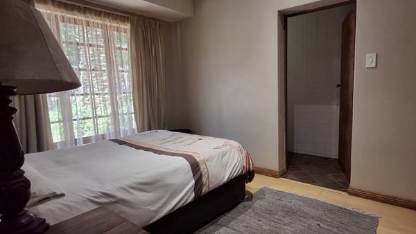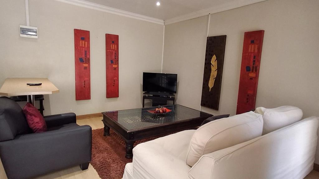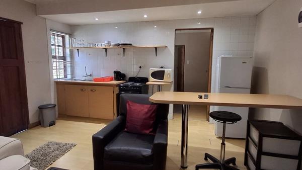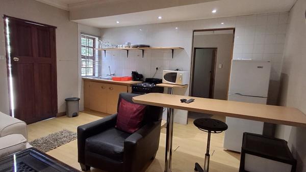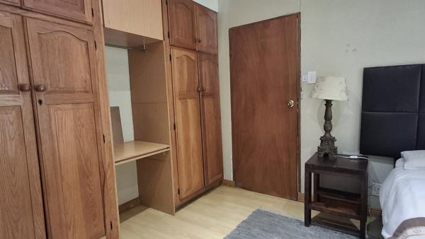 The bedroom features built-in cupboards and a comfortable double bed, while the spacious open-plan TV room seamlessly connects to the kitchen, creating a welcoming living space.