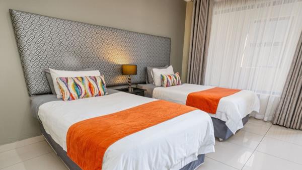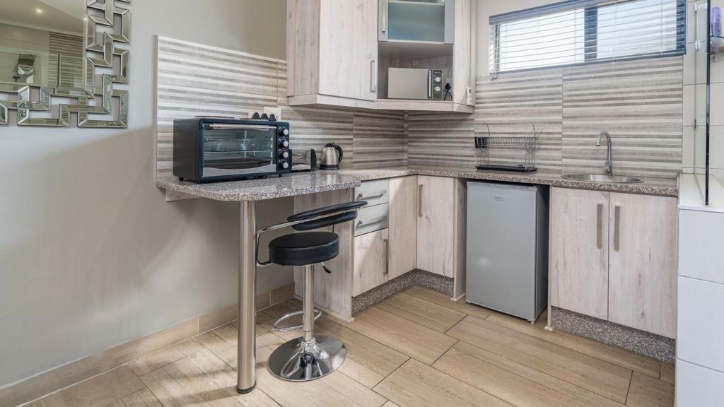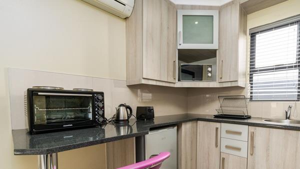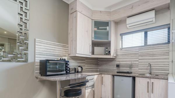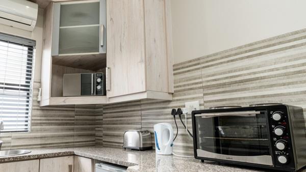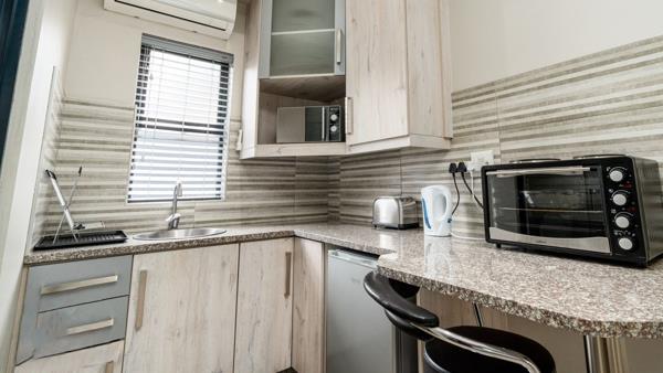 The unit is neatly tiled and has modern built-in cupboards installed in the kitchen and bedroom.