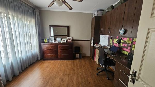 Step inside to find beautiful laminate flooring throughout and an inviting entrance hall. To your right, a dedicated study with fitted cupboards and a desk area is perfect for working from home.