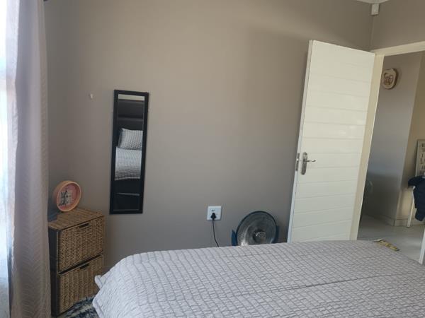 The open-plan living area flows seamlessly into the kitchen, creating a cosy and functional space for relaxing or entertaining. Both bedrooms offer generous cupboard space and are designed for comfort. The bathroom is neat and modern, featuring all the essentials for your convenience.
