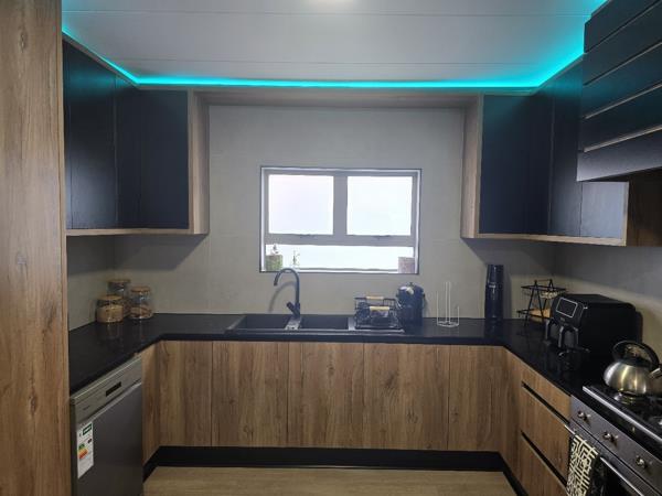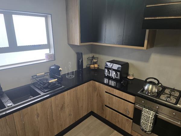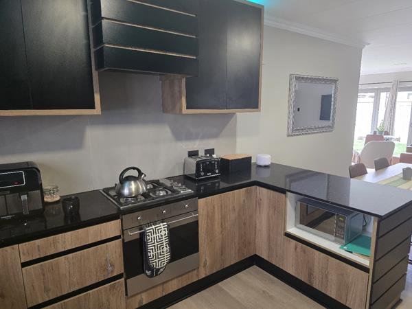 Inside, the home offers a spacious open-plan lounge, dining area, and modern kitchen with stylish two-tone cabinetry, dark countertops, and cohesive wood-look flooring throughout. The kitchen is modern and functional, fitted with a gas hob and oven no integrated appliances.