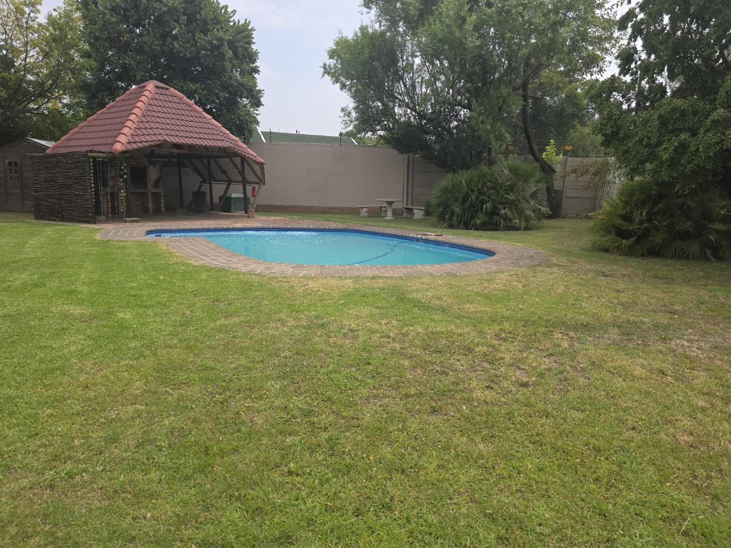 Outdoor Oasis: Landscaped garden, sparkling swimming pool, and a covered lapa with a built-in braai.