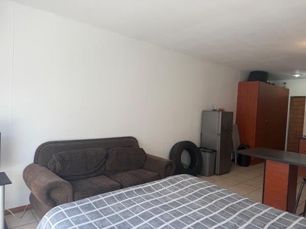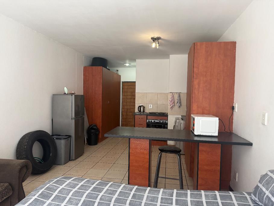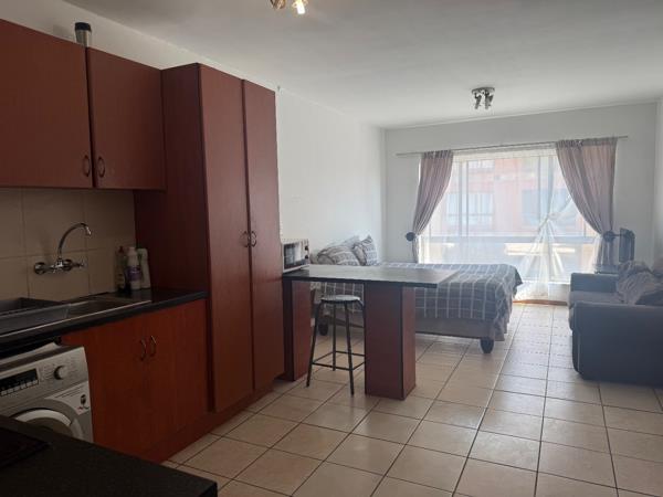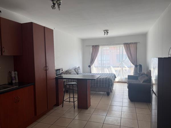 Abachelor flatis available to rent in asecure complex, offering a well-designed open-plan layout that combines the kitchen, lounge, and bedroom area into a comfortable and practical living space.