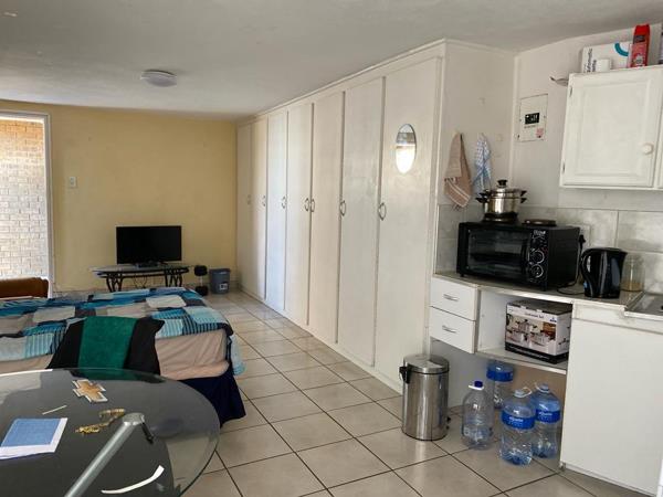 Open plan kitchen, lounge and bedroom area with ample cupboard space (tiled throughout)