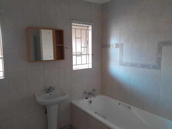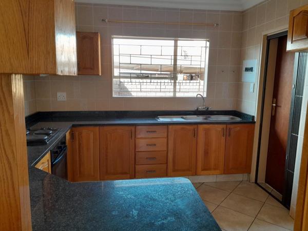 Open plan kitchen and living area with a glass door opening onto a small yard with a stoep and built in braai.