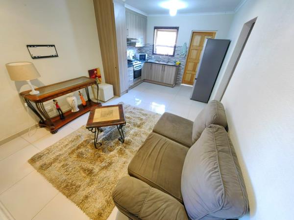 This neat 1 bedroom apartment boasts a neat bathroom with a shower, lovely kitchen, open plan living area. Included in the rental- Wifi, Netflix, smart TV. Water, Electricity up to R400 is included, A manual Jojo tank is installed for essential use during outages, cleaning x 2 times a week, laundry once a week. Suitable for a single person only.