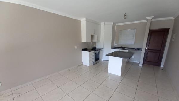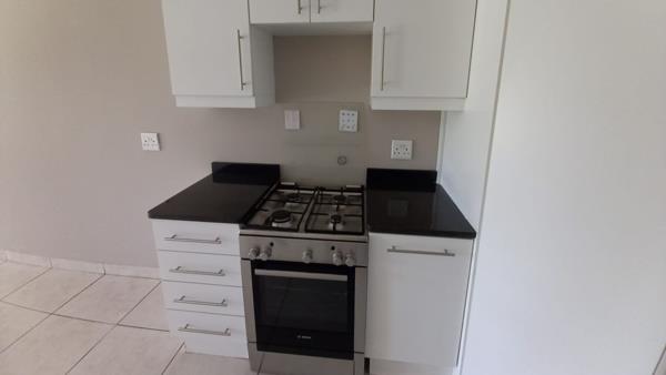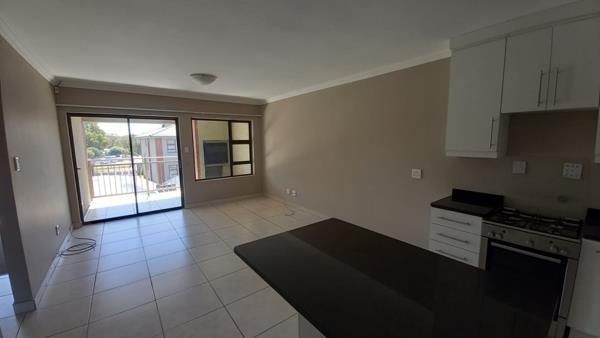 It offers a spacious open plan TV room and kitchen, with a gas stove. Small balcony with a built-in braai.