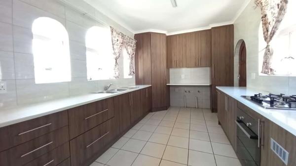 This spacious 4 bedroom family home boasts 2 neat bathrooms, beautiful kitchen with caeser stone tops and a gas stove, large lounge and diningroom, double garages, domestic quarters and a massive pet friendly yard. This property is fitted with a prepaid meter and water is billed.