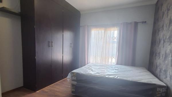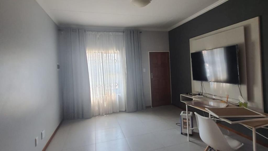 Long tandem garage with sliding door and awning opening to a small paved backyard.