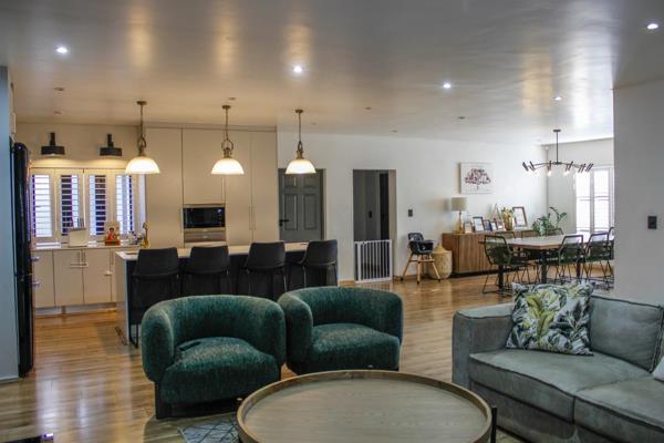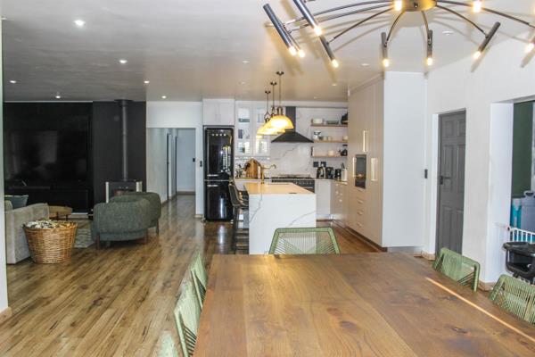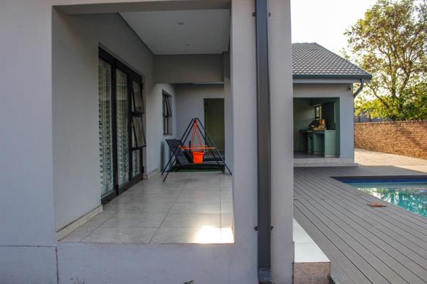 Welcome to this modern and spacious family home that offers both comfort and style. As you step through the front door, youre greeted by an open-plan living space, flowing effortlessly from the dining area into the contemporary kitchen and family room with fire place. A sleek mini bar complements the living area, with large doors leading out to a semi-enclosed entertainment space, complete with a sparkling swimming pool and a stunning wooden patio featuring a pergolaperfect for enjoying sunny days. A built-in boma area with seating adds the ideal touch for cozy outdoor gatherings.