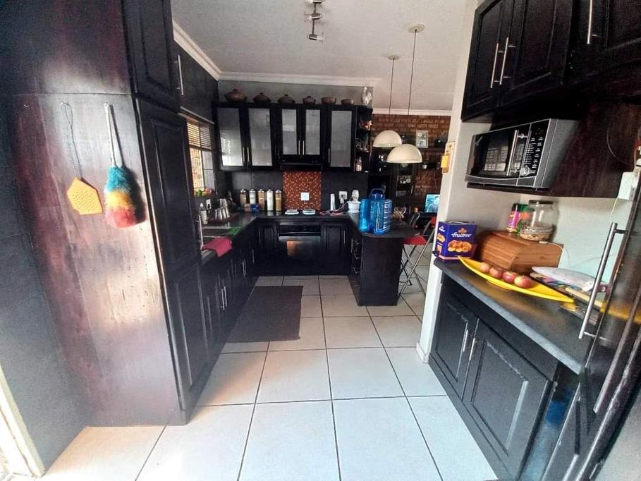 This inviting 3-bedroom, 2-bathroom home is available for rent in the suburban area of Kanonkop, Middelburg. The interior boasts a functional open-plan layout, seamlessly connecting the dining area with the kitchen and living space. Throughout the home, durable tiled flooring ensures easy maintenance, complemented by distinctive exposed brick accent walls that add character and a modern industrial touch. The kitchen is well-appointed with dark cabinetry and features a convenient breakfast bar, ideal for casual dining or entertaining. Modern track lighting illuminates the main living areas, enhancing the contemporary feel.