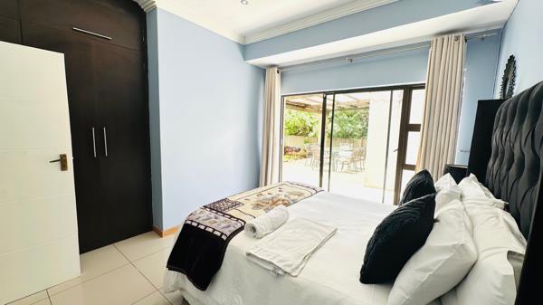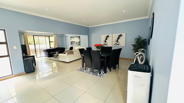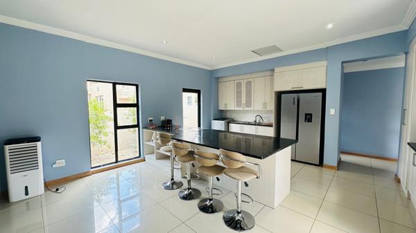 At the heart of this home is a stylish, open-plan kitchen complete with a scullery and an electric stove, seamlessly flowing into the dining area and lounge. Designed for entertaining, an enclosed patio accessible through sliding doors enhances the indoor-outdoor living experience and creates an inviting area for social gatherings.