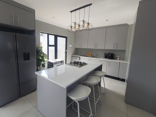 The open-plan kitchen flows seamlessly into the lounge and dining area, creating a warm and inviting living space. Large sliding doors open onto a covered patio, ideal for entertaining, and lead to a spacious, landscaped garden, inclusive of garden services with a sparkling pool.