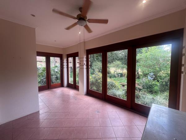 2 living areas: one indoor lounge and one glass-enclosed patio that opens onto the garden