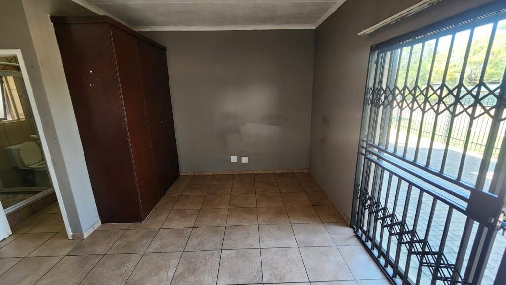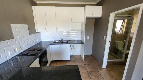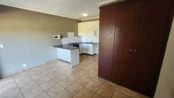 The apartment features an open-plan kitchen with ample cupboard space, leading into a comfortable living area. The bedroom is well-sized with built-in cupboards, and the bathroom is clean and functional. The complex offers excellent security with controlled access, ensuring peace of mind for residents.