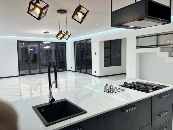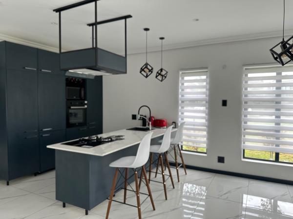 Open plan with shiny porcelain tiles throughout, this home has a functional kitchen with built in fridge, freezer and microwave. Central island with prep bowl and gas and electric hob. Scullery has provision for 3 under counter appliances. Plenty cupboard space. Upstairs has views of the surrounding mountains where the bedrooms are with modern bathrooms and balconies. All finishes of superior quality, aluminium window frames and designer lighting throughout.
