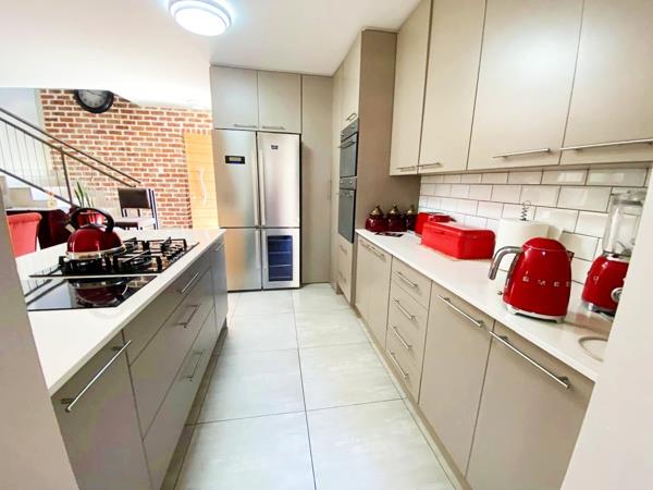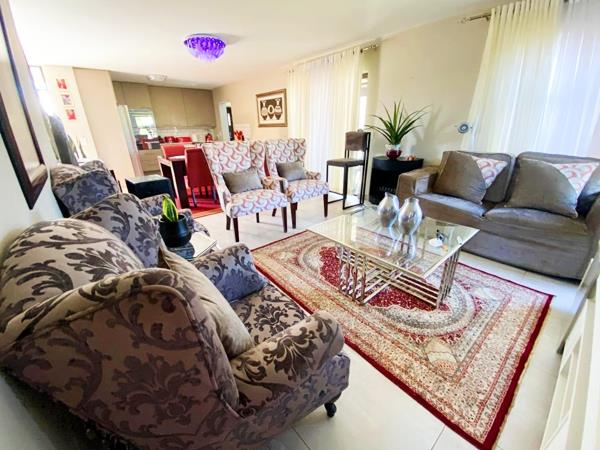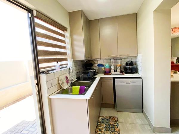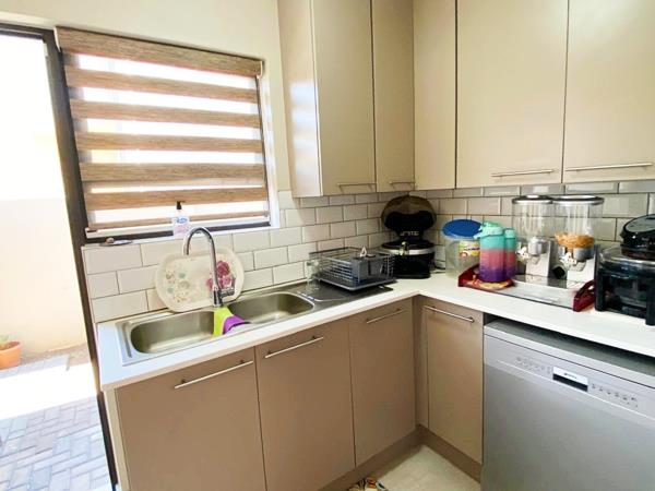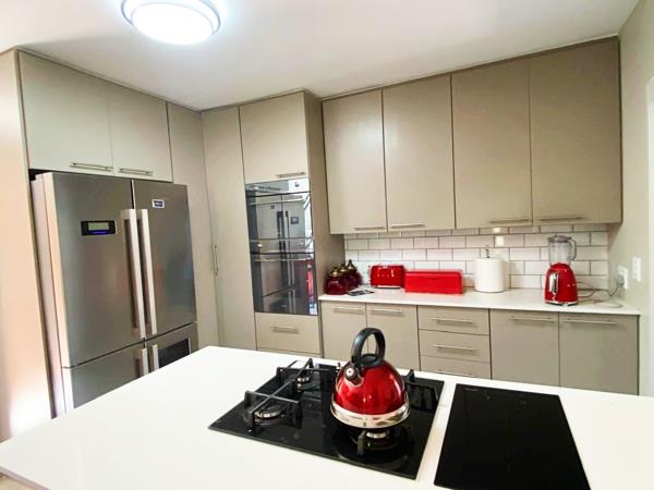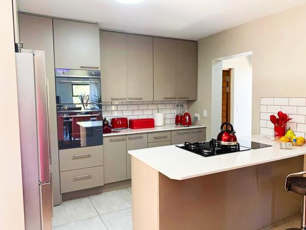 This modern home offers three spacious bedrooms with built-in cupboards and two stylish bathrooms, including a main en-suite. The open-plan kitchen flows seamlessly into the living area, creating a warm and inviting space ideal for both everyday living and entertaining. A covered patio overlooks the private garden, providing the perfect setting for relaxed outdoor gatherings.