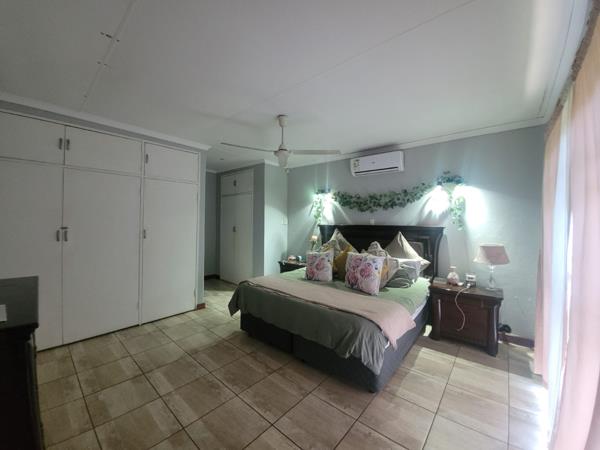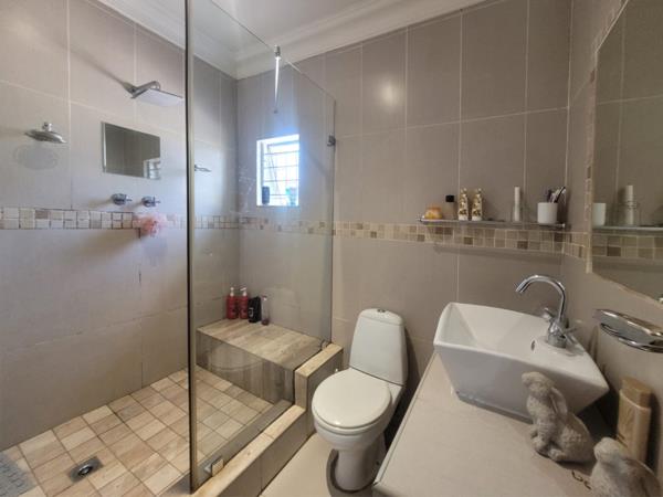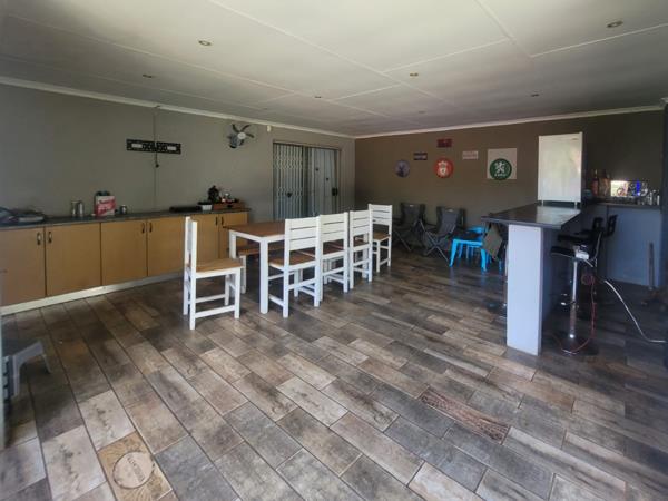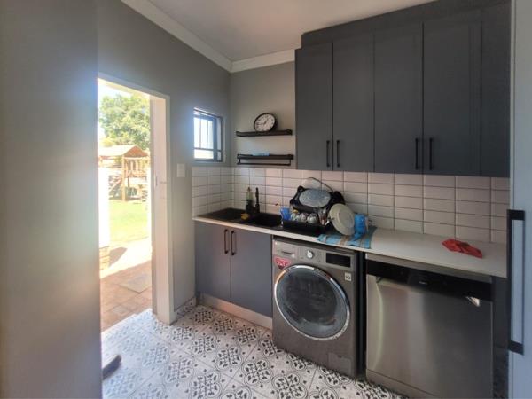 Perfect for entertaining, the covered patio boasts a built-in bar and built-in braai, overlooking a small swimming pool ideal for relaxed summer days.