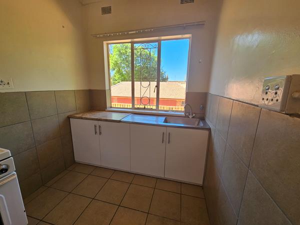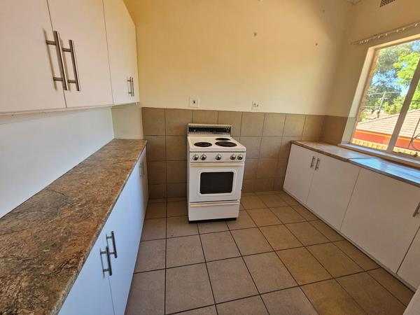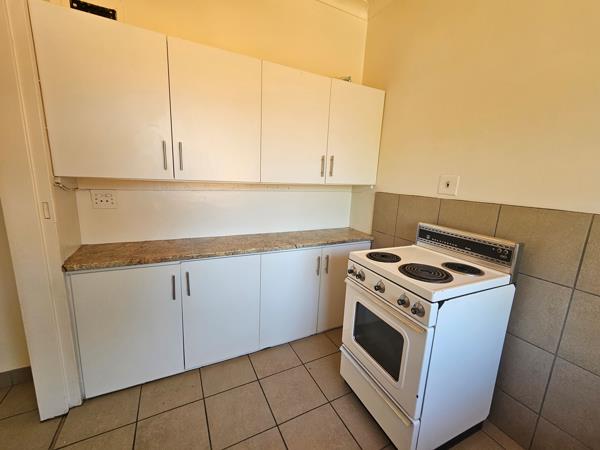 Spacious, fully-tiled one-bedroom flat available. The kitchen is equipped with cupboards and a stove, while the large lounge area opens up to a balcony.
