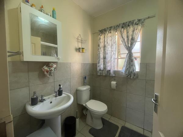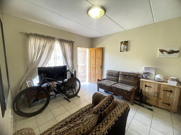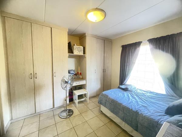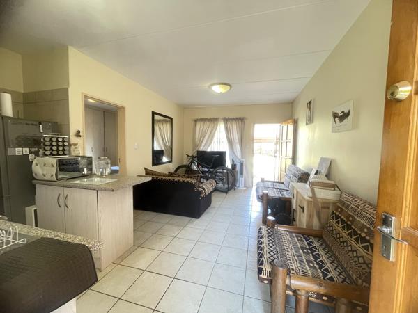 Spacious Ground floor, one bedroom apartment with open plan living area, kitchen offering enough cupboard space, north facing bedroom with en suite bathroom - spacious shower. Carport in secure complex with electrical fence and motorized gate.