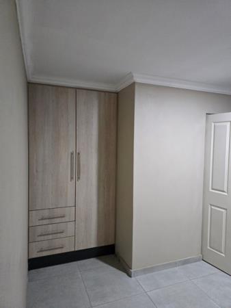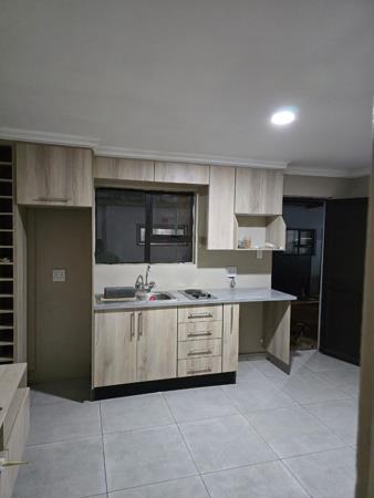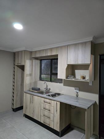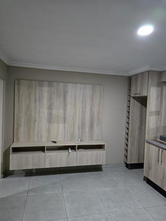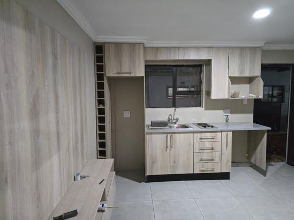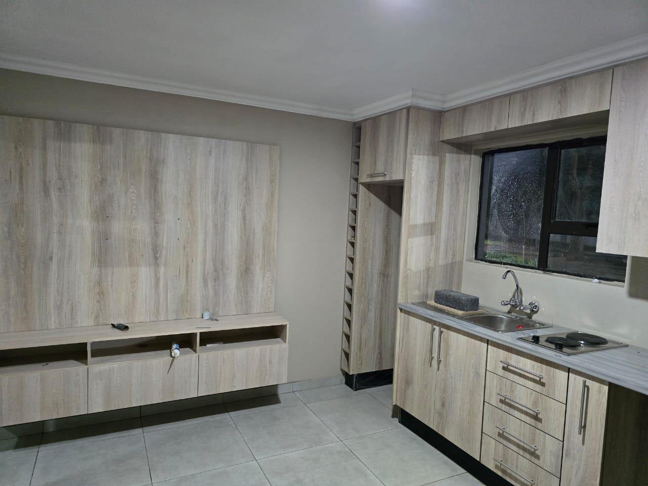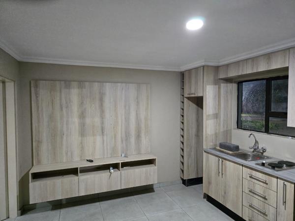 This cozy apartment offers a spacious open-plan kitchen and lounge area, fitted with built-in cupboards for convenient storage and a TV stand for added comfort. The layout is practical and welcoming, ideal for relaxed living.