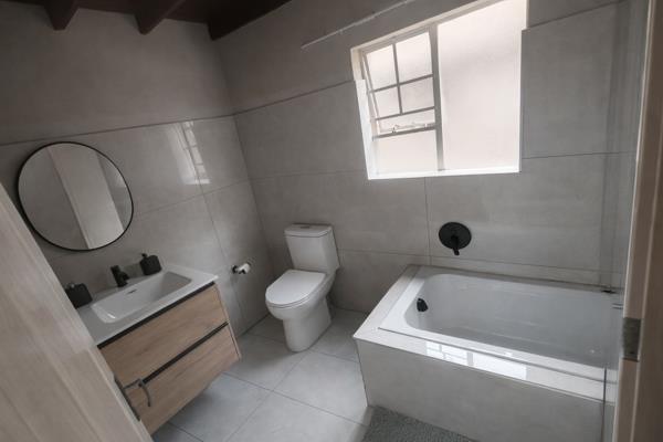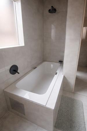 Sleek Bathroom: 1 full, modern bathroom with premium fixtures and a large soaking tub.