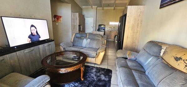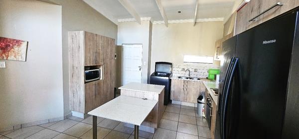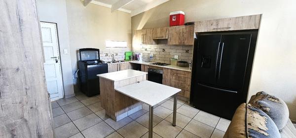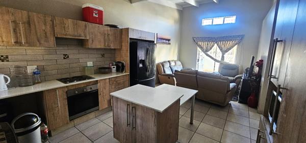 The open-plan kitchen and lounge area create a seamless flow, leading out to a covered patio perfect for entertaining guests or enjoying relaxed weekend braais with family and friends, complete with a built-in braai.