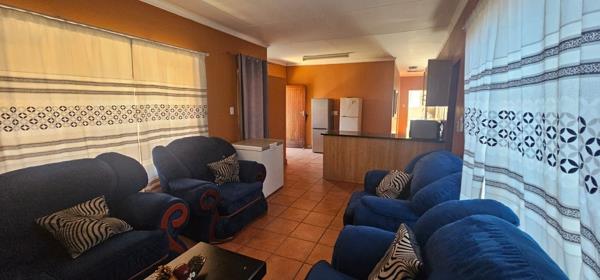 The open-plan kitchen and lounge flow seamlessly onto a patio, perfect for relaxing or entertaining. Located in a secure complex, the home includes a double garage with additional double parking.