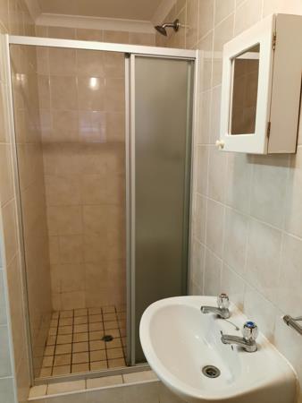 This bachelor unit has a bathroom with a shower, built in cupboards in the kitchen and a stove.