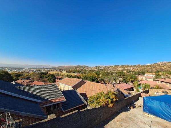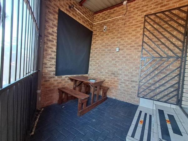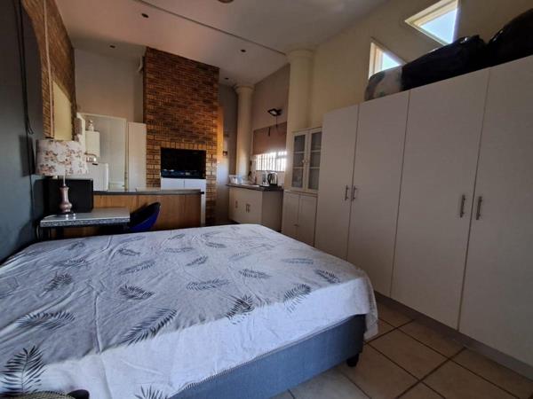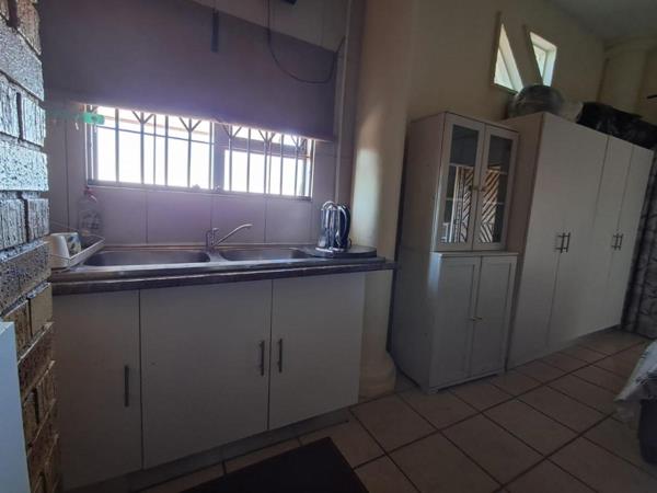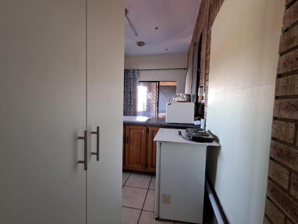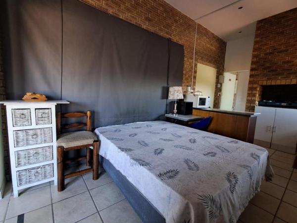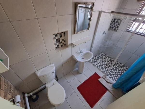Bathroom with shower basin and toilet. Kitchen equipped with microwave, airfryer, gas and electric hob, fridge washing machine and cutlery.