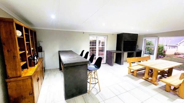 For entertainment enthusiasts, discover an inviting entertainment area featuring a built-in bar counter, a built-in braai with a prep bowl, and seamless access to a sparkling pool - an ideal setting for gatherings and relaxation creating the indoor-outdoor living feel.