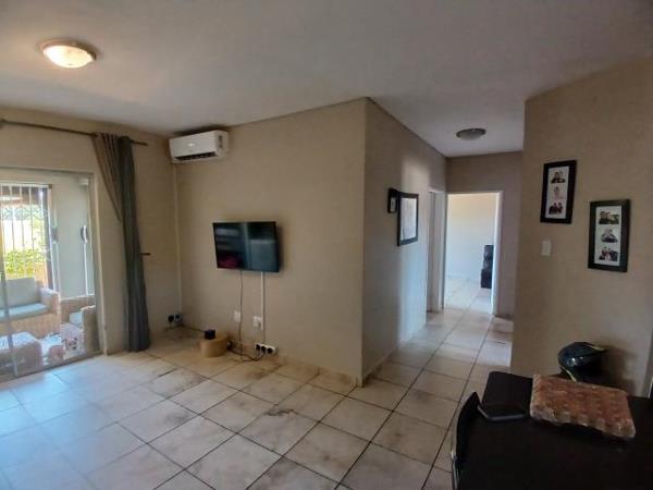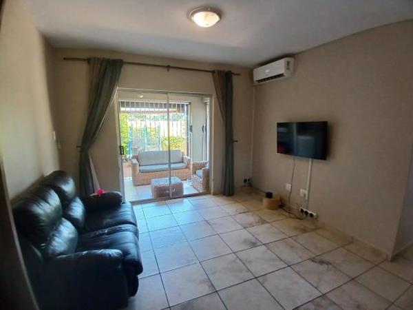 Living area with a aircon that walk out to the patio with a buil-in braai with sail ownings